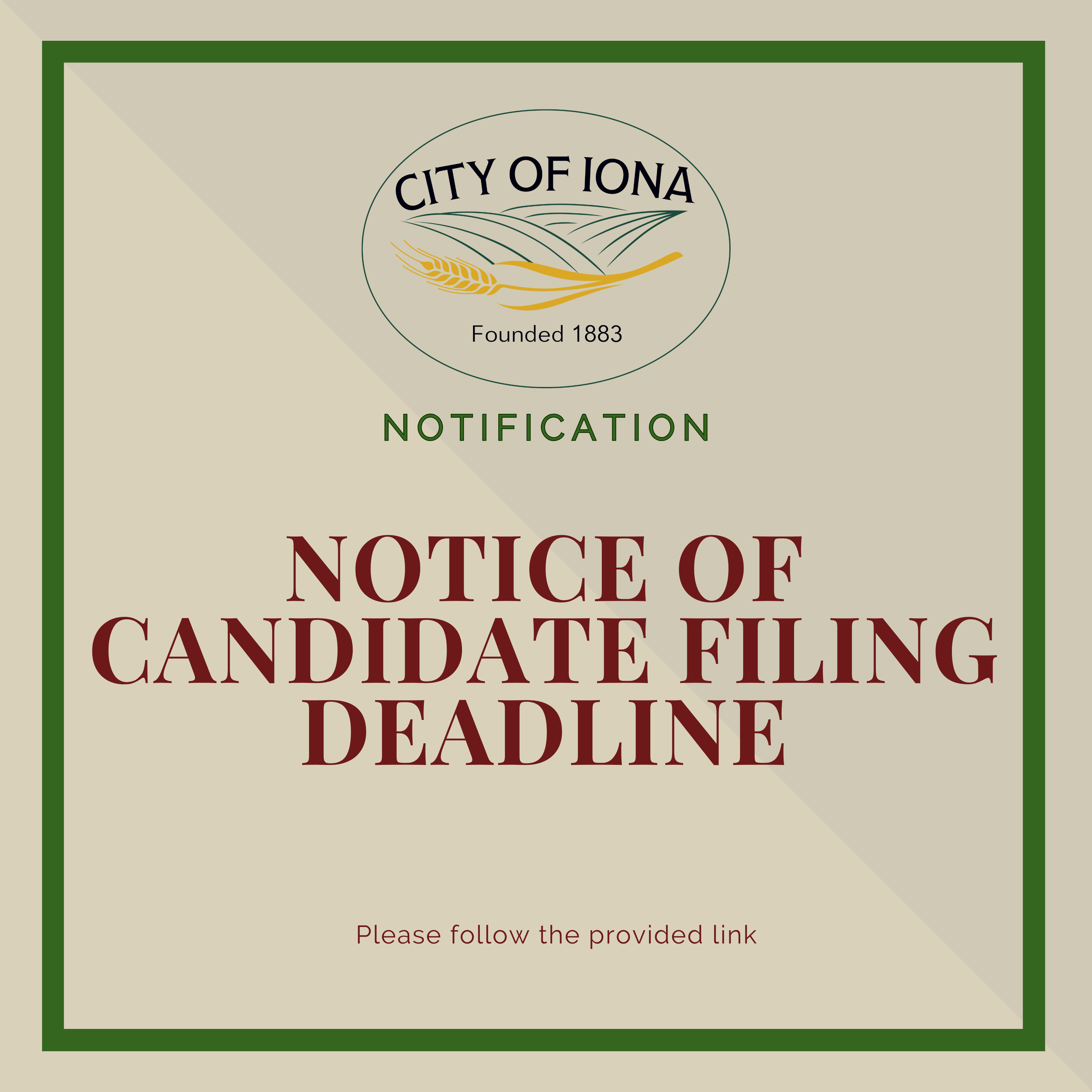 Notice of Candidate Filing DeadlineNOTICE OF CANDIDATE FILING DEADLINECITY OF IONA, IDAHONOTICE IS HEREBY GIVEN: That the general election to be held in and for the City of Iona, Idaho,…